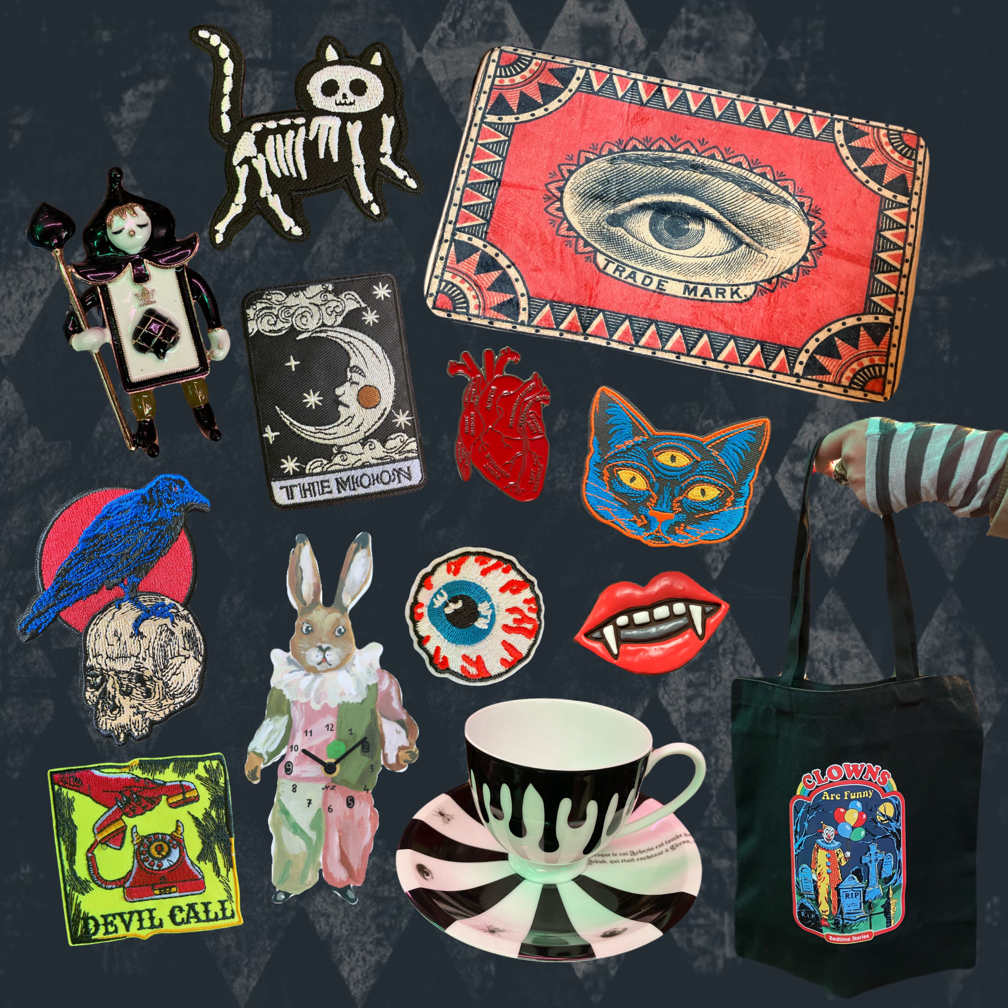 ― 墓地に舞う、あざやかな悪夢 ― 静寂の墓地にたたずむ一人のピエロ。 ポップで不気味可愛いトートバッグ。 当店のピンズやブローチ、キーホルダーや缶バッジ、ワッペンなどでカスタムするのがより可愛くなっておすすめです! サイズ: W33cm×H62mm (手持ち部分含む)