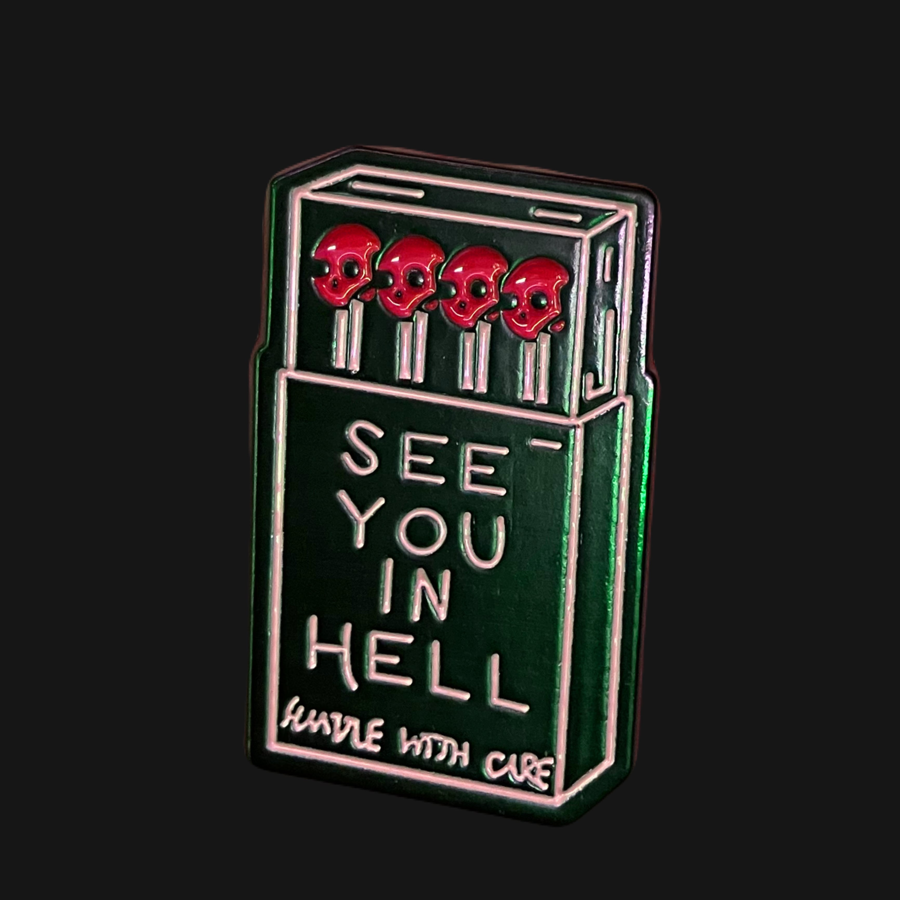 「SEE YOU IN HELL」の文字とスカルマッチが印象的な、ダークでユーモアのあるピンズ。