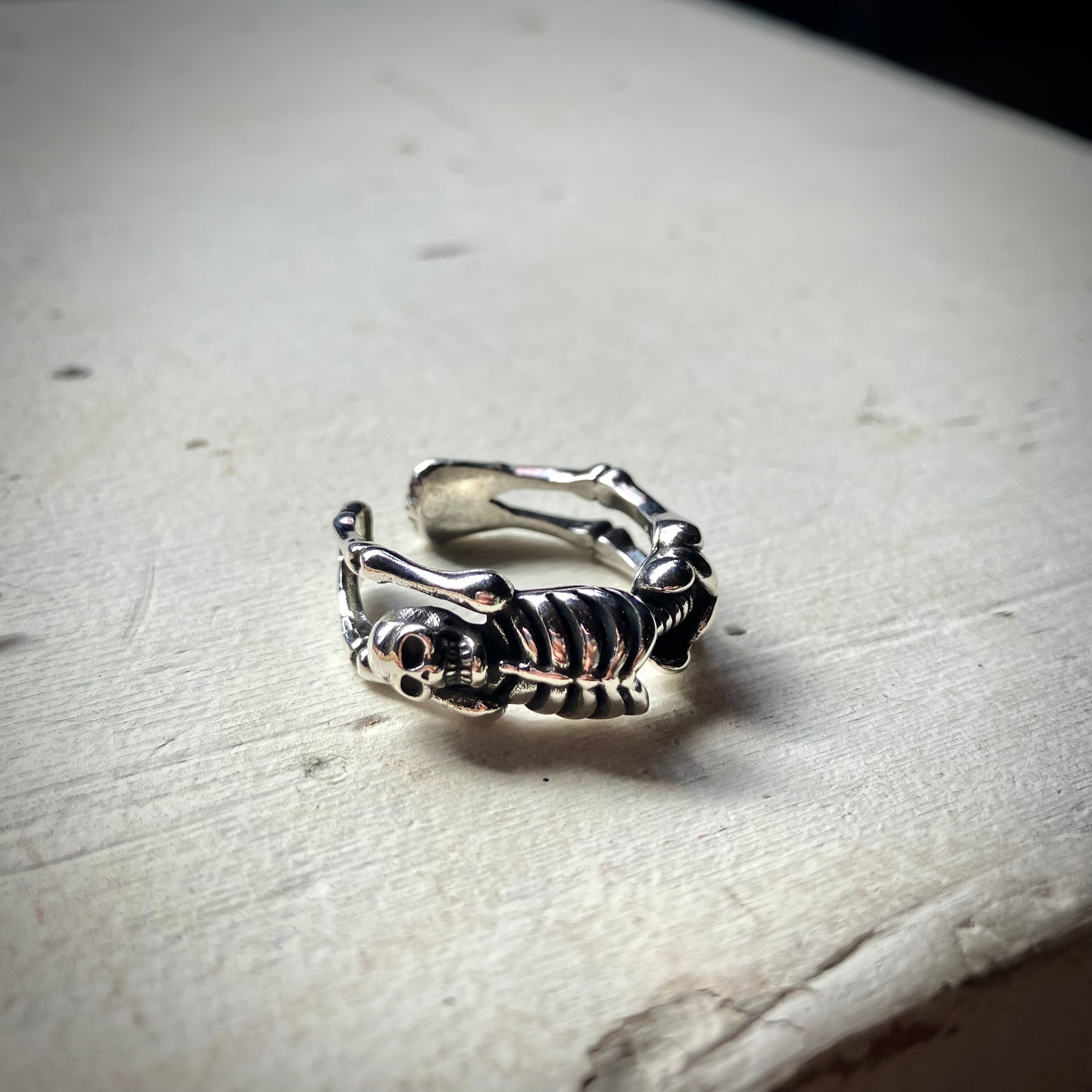 反り返る骸骨が、指に絡みつくようにデザインされたリング。